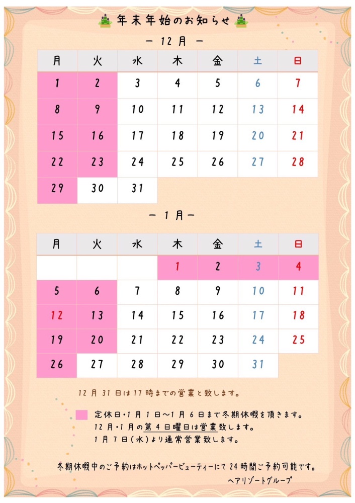 12月、1月の定休日は変則的になりますが