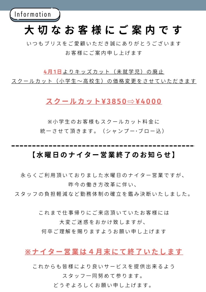 スクールカット(小学生~高校生)の価格変更を